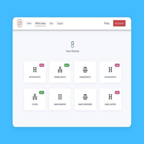 アニメーションの種類: ボックスの反転、スパイラルイン/アウト、キャプションの表示、スライド式の画像比較など、それぞれのバリエーションに応じた8種類のHover Effectが含まれています。